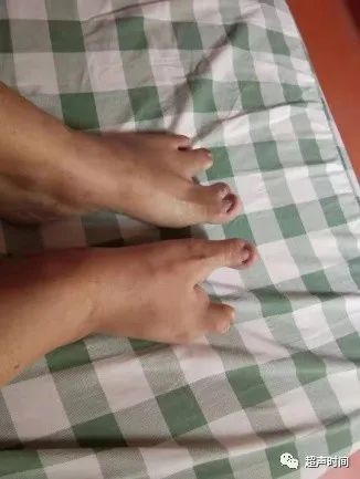 图 2 孕妇左足中趾消失,右足第二、第三趾消失,双侧足趾被分为两组