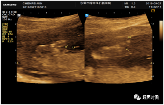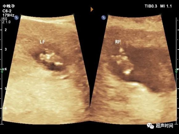 图 4 孕 17ᐩ 周。足底切面更清楚显示胎儿双足「V」形裂开征象