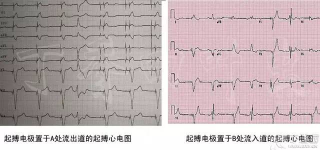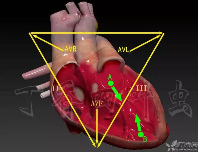 如果除极激动来自于窦房结或 A 点(流出道),那么除极大方向和 II、III、AVF 的大方向是一致的,所以在 II、III、AVF QRS 主波方向向上,如果来自于流入道 B 点,可想而知心脏除极由下向上,和 II、III、AVF 大方向相反所以在 II、III、AVF QRS 主波方向向下,那么它很可能是个起源于流入道的室早或室速。
