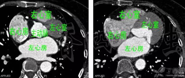 有了正确的心脏观我们就不会在 CT 片上的左侧去寻找左心房、右侧去寻找右心室,如图。
