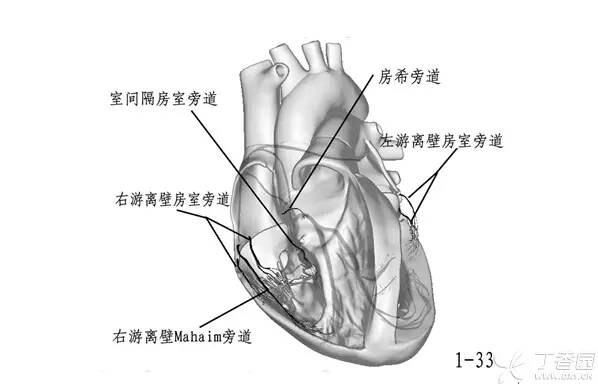俗话说只要锄头轮的好,没有墙角挖不倒,有了旁道心脏的和谐生活就被搅乱了,在临床上表现为预激综合征。下图是心脏常见的旁道示意图(图 1-33)。