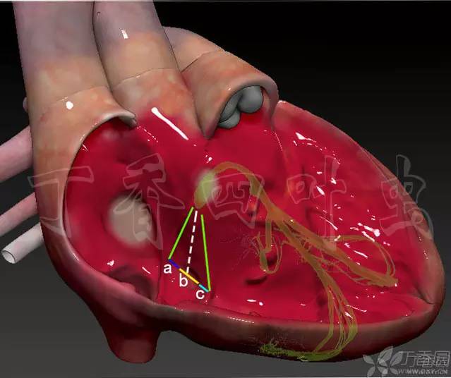 b 为冠状静脉窦口直径,a 为冠状静脉窦口到 Todaro 腱最短距离,c 为冠状静脉窦口到三尖瓣隔瓣瓣环最短距离。大家可以从图上看到 Koch 三角顶部刚好就在室间隔膜部下方,因此从冠状静脉窦口,到室间隔膜部就是 Koch 三角的高。