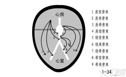 我们通过排列组合的方法很容易记住解剖命名。「旁束」也可以用「束、旁道、连接、纤维」等代替,比如房束旁束也可以叫房束旁道、房束纤维,都是一个意思。(图 1-34)