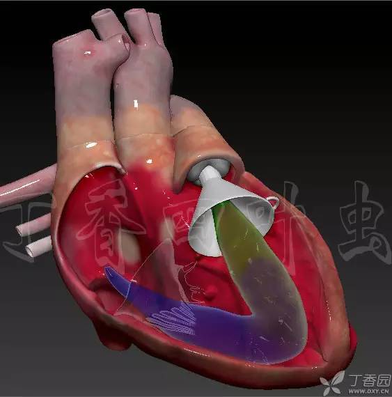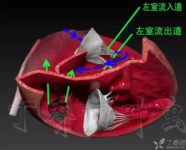 那问题又来了何谓流出道、流入道?与其啰里啰嗦的解释不如直接模拟一个血流,蓝色血流代表流入道它位置较低,绿色代表流出道它位置较高。